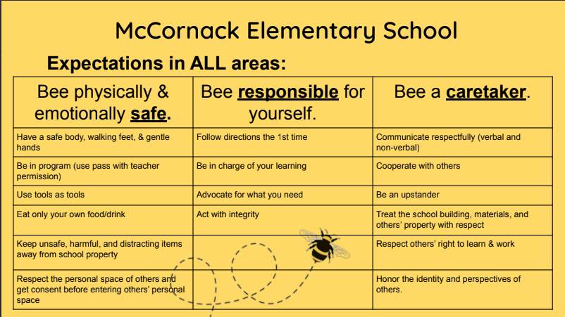 This week our highlighted area is the cafeteria: Our basic three school expectations apply outside as well as in the building. See the matrix for specifics about being physically and emotionally safe in the cafeteria as well as being responsible and a caretaker. It's incredibly helpful to go over these with your child at home so that they know that you are aware of McCornack expectations. Please check in with Mrs. Kuhl or anyone on the Climate and Culture team if you have questions regarding any of our school expectations!: