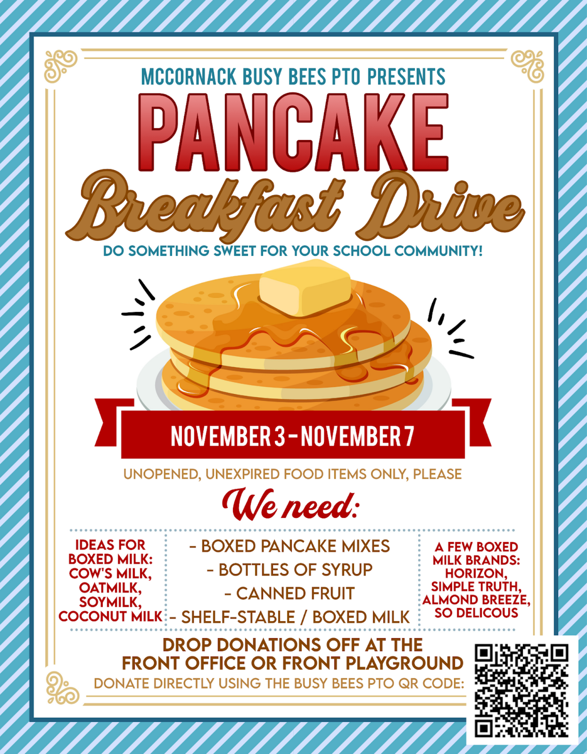Meal Kit Drives: Wow! We are so excited about the response to our first meal drive! Our community really pulled together and we are able to distribute TONS dinners to students and their families! Thank you so very much. This coming week, November 3-7, the McCornack Busy Bees PTO will be holding a Pancake Breakfast Drive! We will be gathering donations of boxes of pancake mix, bottles of syrup, canned fruit, and shelf-stable // boxed milk before and after school at both the front office door and the front playground. We could always use extra eyes on the donation stations, so if you’re dropping off or picking up a child and can help supervise one of those areas for a few minutes, we’d hugely appreciate it! Check out the flyer to see all the info in one place as well as basic guidelines (unexpired and unopened food items only, please). Please help us make this a success and build up our wonderful learning community!