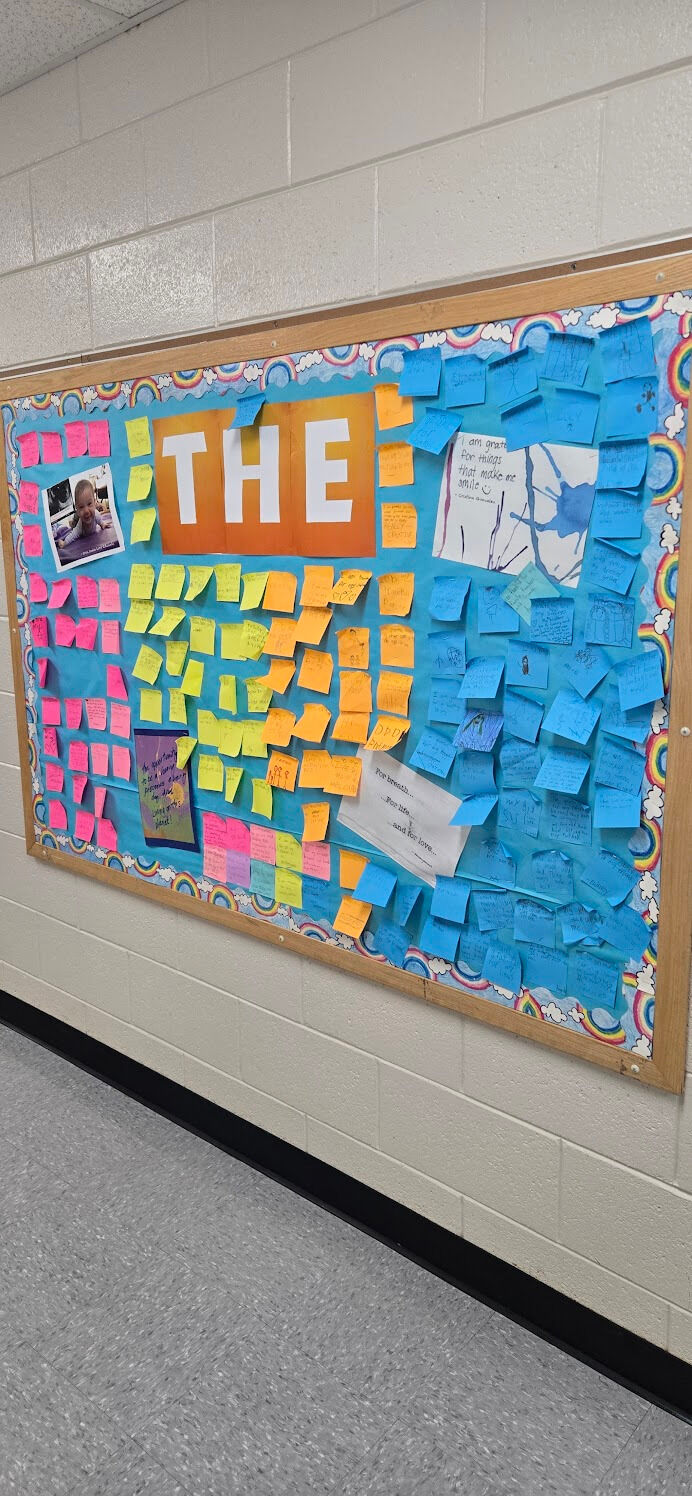 Starting on the first day of the campaign, orange "Gratitude Spots" were placed in hallways throughout the school to remind students and staff to think about one thing they are thankful for. When they stepped on one, they were to think about what they are thankful for and share it with your child. Each morning, students wrote their gratitude on sticky notes to create a beautiful "Gratitude Wall" of notes which were displayed in the main hallway. If you would like to add your own gratitude to the wall, send a sticky note with your child of the things YOU are grateful for!